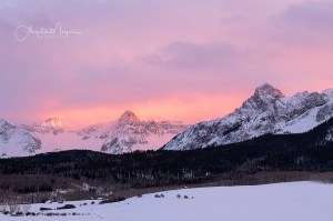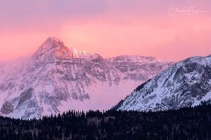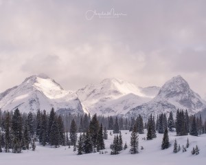 In “Gentle Giants” I was visiting Silverton, CO with my husband, it was free ski weekend so he hit the slopes while I went searching for photo opportunities. It was a very cloudy day and was starting to snow. As we were leaving for the day, I suggested we drive up to Molas Pass so I could see what it was doing there. As we arrived, it was snowing lightly and then got harder but to my delight, it was gorgeous, the light so spectral. It felt so magical, soft and serene. I trudged through thigh high snow to a little rise to capture the two scenes featured. It was just so beautiful, I felt like a little kid at their first circus show! The snow let up for a few minutes, then the sun peaked out between the clouds and kissed the peaks with light. What a moment to remember.